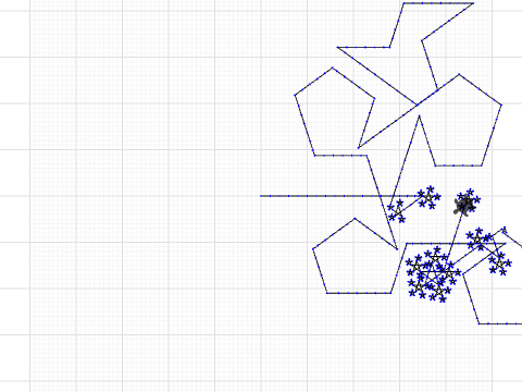 This project was an unexpected outcome of a discussion with a Bennington College student. His challenge to himself was a star that contained stars radiating from each point of the central star. In exploring this, I ended up here. Look inside for more commentary.